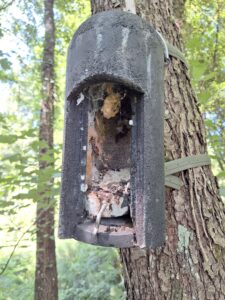 Lors de l’inspection des gîtes en 2024, aucun indice ne montre l’occupation de gîte par les chiroptères. Cinq des 11 gîtes installés étaient vides. Les autres gîtes étaient occupés par des oiseaux ou des insectes (fourmis, frelons…).
