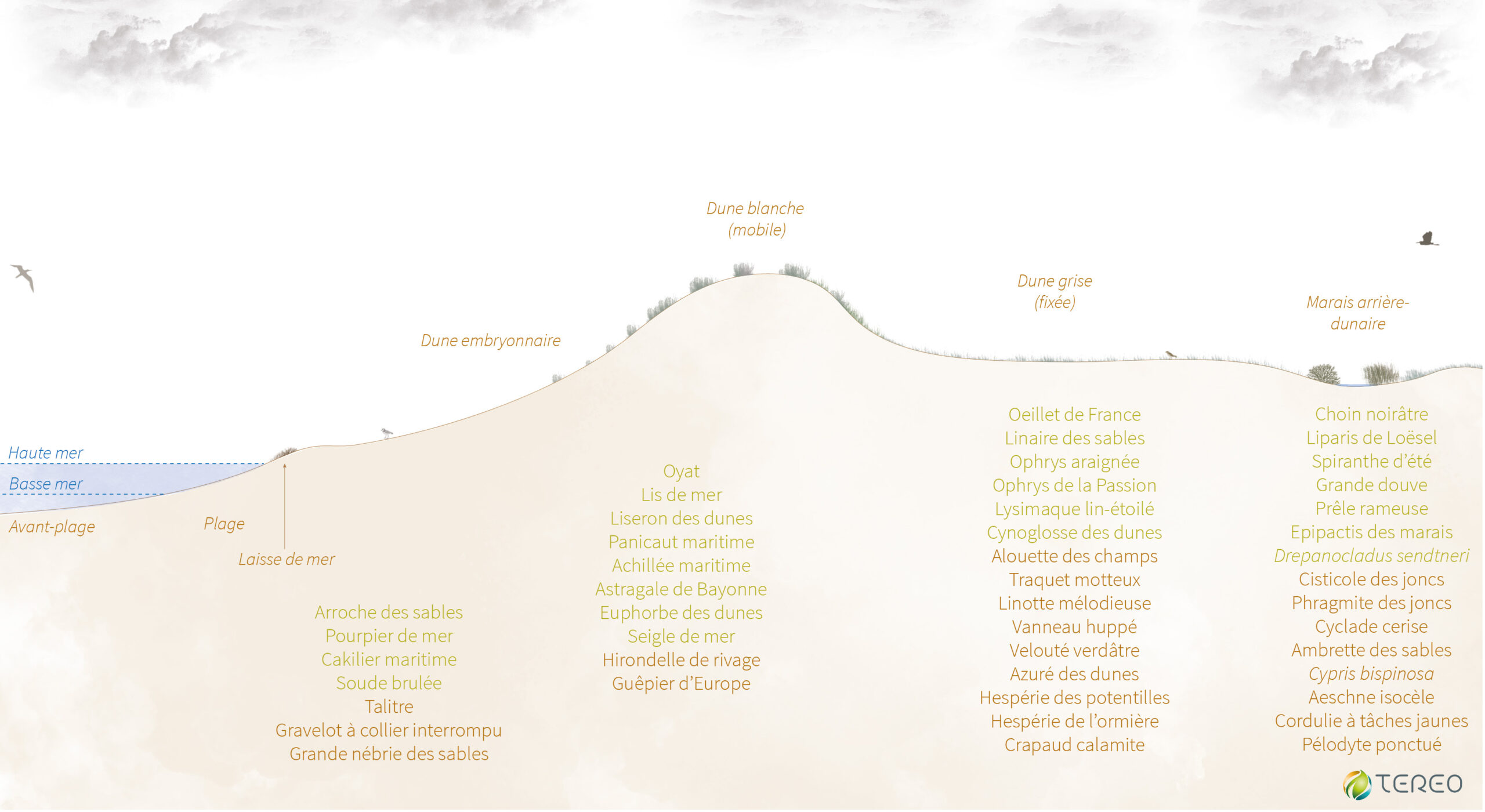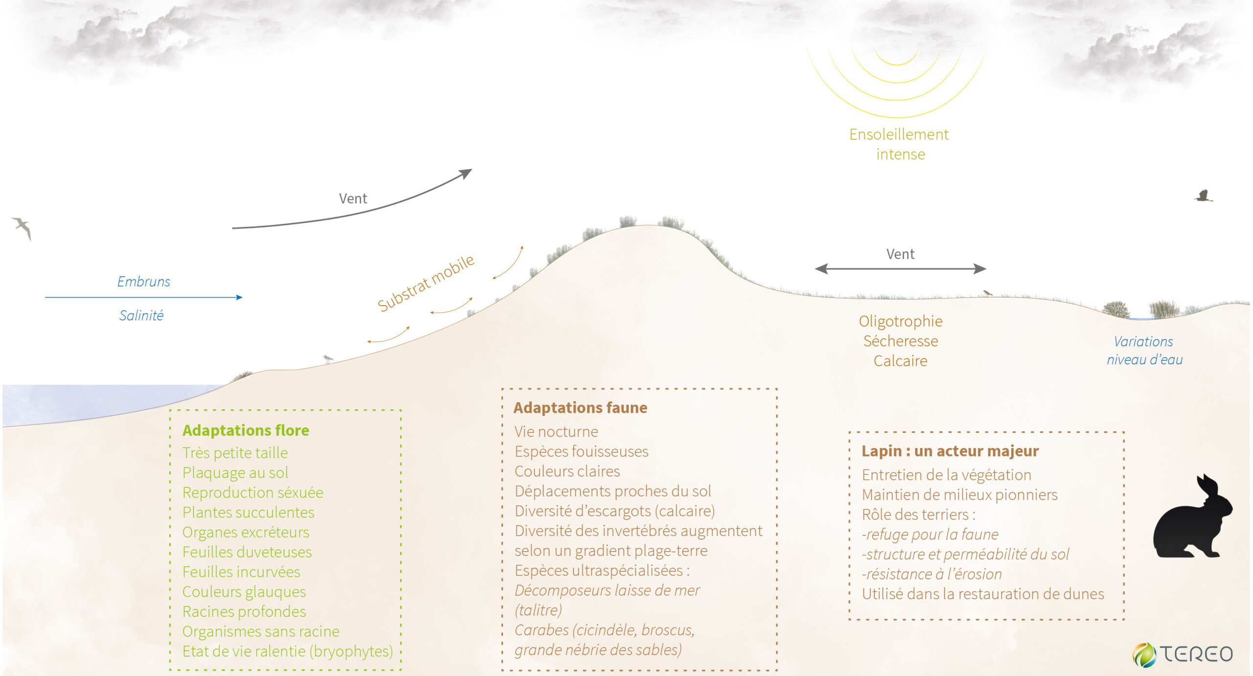 Les figures suivantes permettent de visualiser les contraintes écologiques, les stratégies adoptées par la biodiversité pour y répondre et le nom de quelques espèces emblématiques de chaque type de dune.