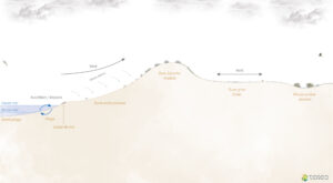 Chaque système dunaire présente son propre fonctionnement avec sa morphologie propre et des évolutions dans le temps et dans l’espace. La figure suivante permet d’illustrer un profil type de système dunaire et de visualiser les grandes forces à l’œuvre sur les différentes portions.