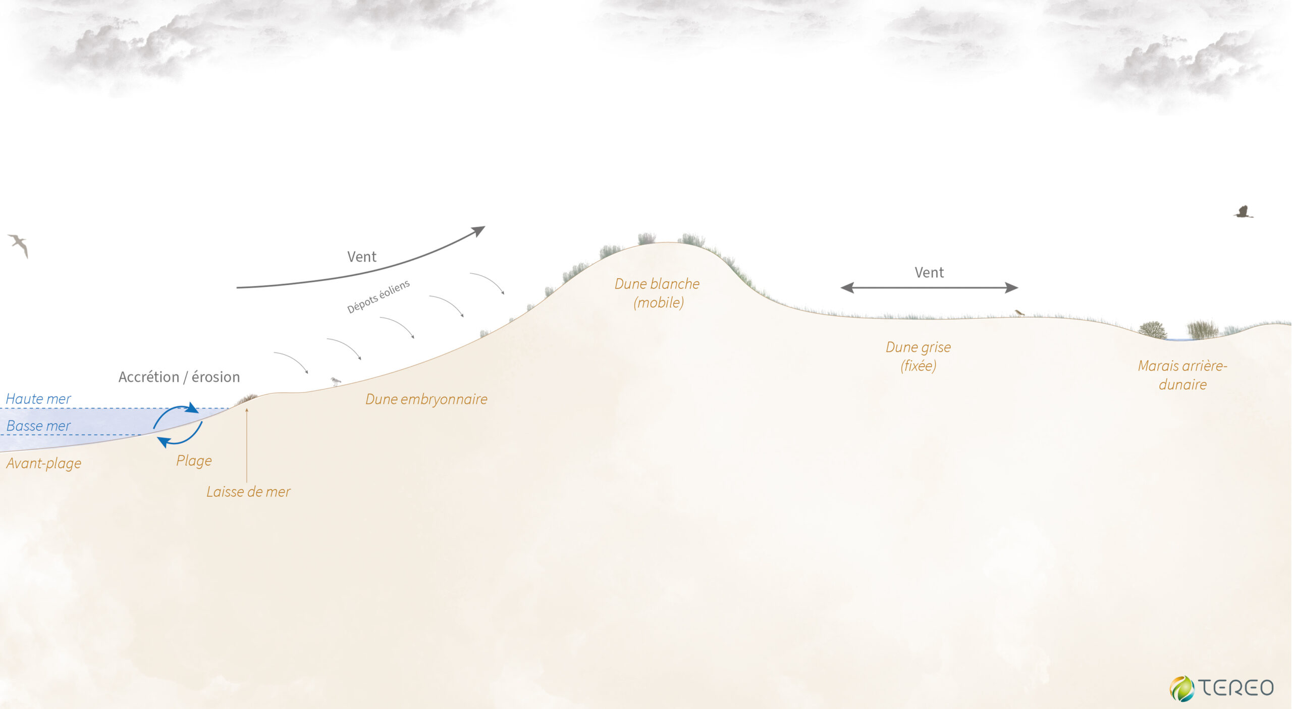 Les écosystèmes dunaires se forment par l’interaction de processus physiques, chimiques et biologiques complexes. Ils résultent d’un équilibre délicat entre d’une part l’action de la mer et du vent qui mettent le sable en mouvement et d’autre part l’action du relief, de la laisse de mer et de la végétation qui favorisent son dépôt et sa fixation. Comme pour les rivières, la géomorphologie permet d’appréhender le fonctionnement passé et actuel des espaces naturels par une lecture du paysage. La chimie du sol est influencée par le sable et les embruns (salinité), les débris de coquillages (apport de calcaire) mais aussi les mouvements de l’eau. Cet équilibre délicat permet de créer un gradient d’habitats naturels pionniers (de la plage à la dune blanche) ou stabilisés (dune grise). Au gré des évènements météorologiques et du temps, le sable des dunes est en mouvement tantôt côté mer tantôt côté terre.