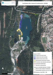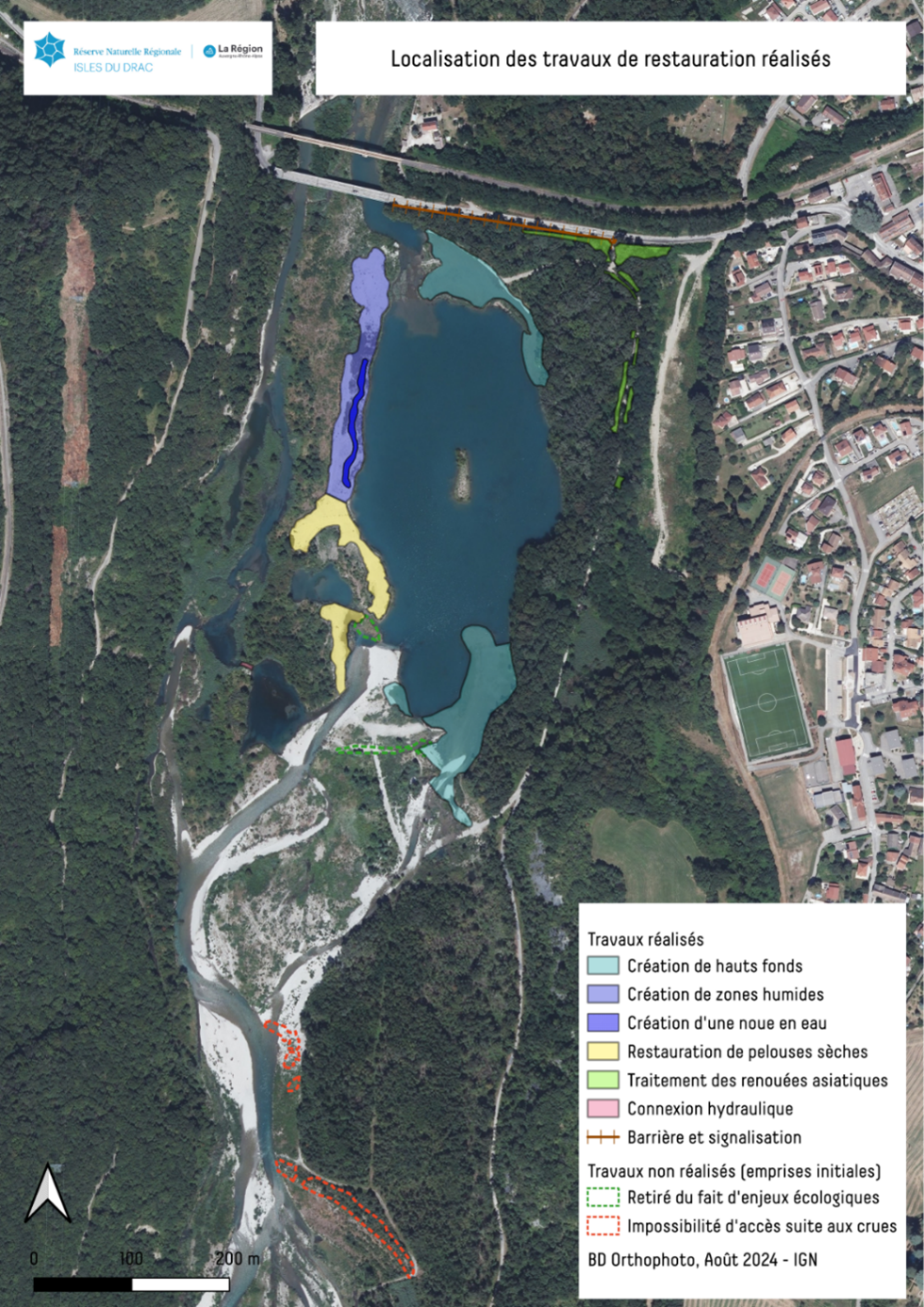 Le gestionnaire de la réserve naturelle des Isles du Drac, Grenoble Alpes Métropole, a mené des travaux de restauration écologique en 2023-24 sur la gravière de la Rivoire et le lit du Drac. Ces travaux ont permis la création de hauts-fonds (en bleu ciel) et de zones humides (en bleu foncé) plus ou moins connectées au plan d’eau, par retrait d’un ancien merlon, dont une noue un peu plus profonde (en bleu roi).